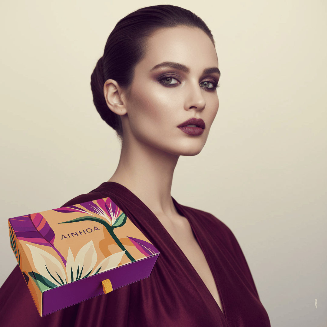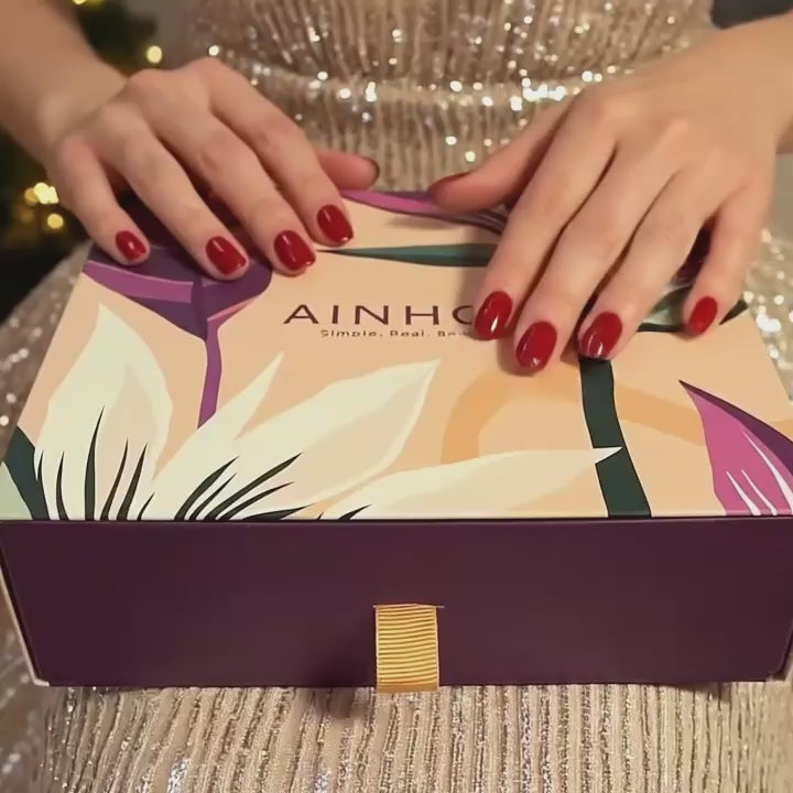 Gaveæsken, som er en del af AINHOAs BOTANICAL COLLECTION, tilbyder et luksuriøst hudplejeprogram til fugtpleje i et etisk format. Den genanvendelige "Jewelry-Style" æske er fremstillet af karton fra forvaltede skove (FSC-certificeret) og er uden unødvendig plastfolie. Ved at købe gaveæskesættet opnås ligeledes en mærkbar stor besparelse sammenlignet med enkeltkøb af de fulde størrelser.