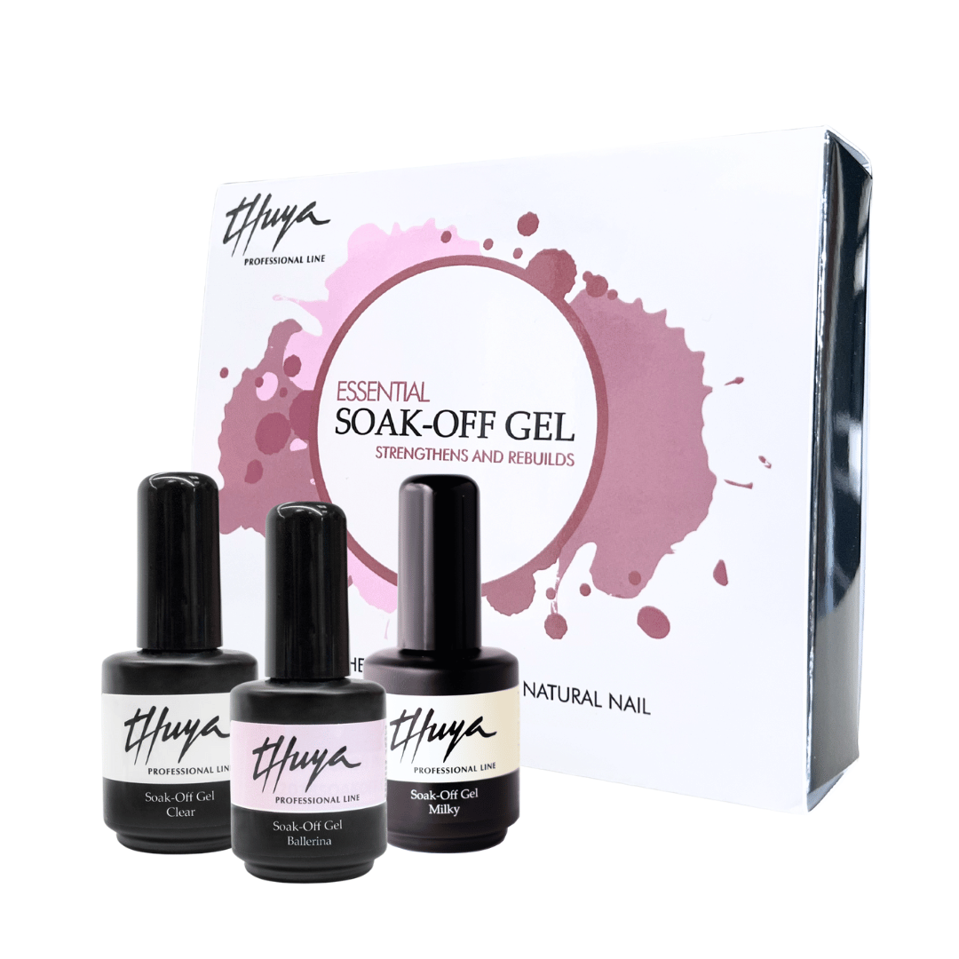 Thuya Soak Off Gellak er en vegansk gellakserie udviklet specifikt til at levere både forstærkning og æstetisk perfektion af naturneglen. I modsætning til traditionel Gel Polish, som Gel On-Off og B-Color Gel, har Soak Off Gel en tykkere, selvnivellerende tekstur, som gør den til et uundværligt og yndet værktøj for professionelle, der arbejder med neglebidere og/eller skrøbelige, bulede, revnede, skadede eller ujævne negle, som fx ofte ses på fødder.
